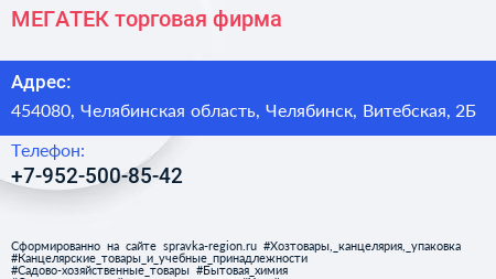МЕГАТЕК, торговая фирма по адресу 454080, Челябинская область, Челябинск, Витебская, 2Б в дальнейшем Организация, размещена в следующих категориях: