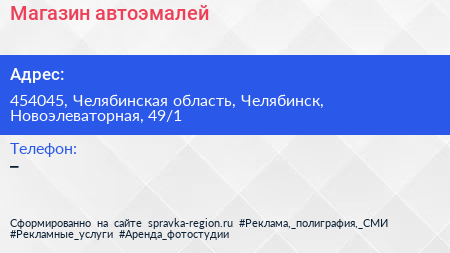 Магазин автоэмалей по адресу 454045, Челябинская область, Челябинск, Новоэлеваторная, 49/1 в дальнейшем Организация, размещена в следующих категориях: