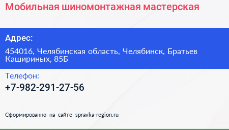 Мобильная шиномонтажная мастерская по адресу 454016, Челябинская область, Челябинск, Братьев Кашириных, 85Б в дальнейшем Организация, размещена в следующих категориях: