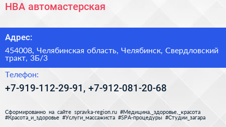 НВА, автомастерская по адресу 454008, Челябинская область, Челябинск, Свердловский тракт, 3Б/3 в дальнейшем Организация, размещена в следующих категориях:
