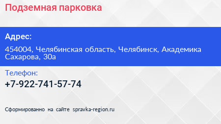 Подземная парковка по адресу 454004, Челябинская область, Челябинск, Академика Сахарова, 30а в дальнейшем Организация, размещена в следующих категориях: