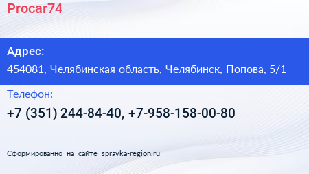 Procar74 по адресу 454081, Челябинская область, Челябинск, Попова, 5/1 в дальнейшем Организация, размещена в следующих категориях: