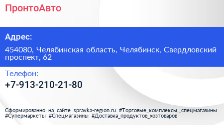 ПронтоАвто по адресу 454080, Челябинская область, Челябинск, Свердловский проспект, 62 в дальнейшем Организация, размещена в следующих категориях: