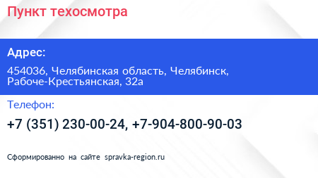 Пункт техосмотра по адресу 454036, Челябинская область, Челябинск, Рабоче-Крестьянская, 32а в дальнейшем Организация, размещена в следующих категориях: