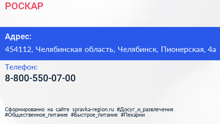 РОСКАР по адресу 454112, Челябинская область, Челябинск, Пионерская, 4а в дальнейшем Организация, размещена в следующих категориях:
