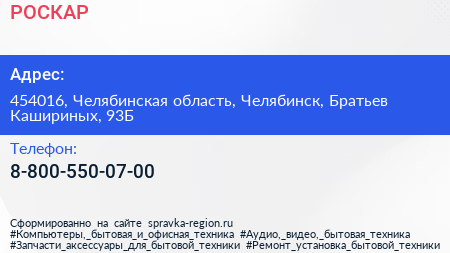 РОСКАР по адресу 454016, Челябинская область, Челябинск, Братьев Кашириных, 93Б в дальнейшем Организация, размещена в следующих категориях: