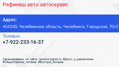 Рефиниш-авто, автосервис по адресу 454100, Челябинская область, Челябинск, Городская, 70/2 в дальнейшем Организация, размещена в следующих категориях: