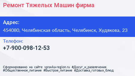 Ремонт Тяжелых Машин, фирма по адресу 454080, Челябинская область, Челябинск, Худякова, 23 в дальнейшем Организация, размещена в следующих категориях: