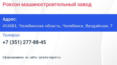 Роксон, машиностроительный завод по адресу 454081, Челябинская область, Челябинск, Валдайская, 7 в дальнейшем Организация, размещена в следующих категориях: