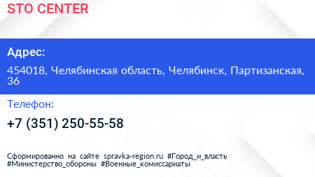 STO CENTER по адресу 454018, Челябинская область, Челябинск, Партизанская, 36 в дальнейшем Организация, размещена в следующих категориях: