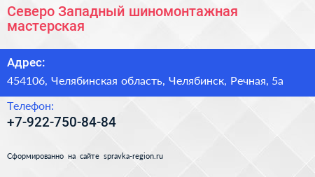 Северо-Западный, шиномонтажная мастерская по адресу 454106, Челябинская область, Челябинск, Речная, 5а в дальнейшем Организация, размещена в следующих категориях: