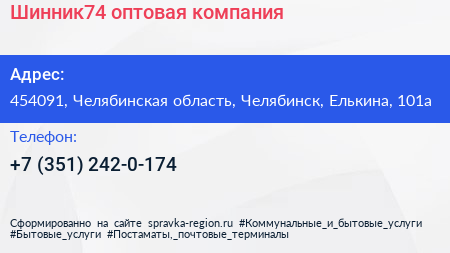 Шинник74, оптовая компания по адресу 454091, Челябинская область, Челябинск, Елькина, 101а в дальнейшем Организация, размещена в следующих категориях:
