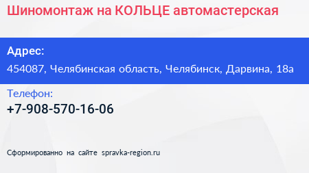 Шиномонтаж на КОЛЬЦЕ, автомастерская по адресу 454087, Челябинская область, Челябинск, Дарвина, 18а в дальнейшем Организация, размещена в следующих категориях: