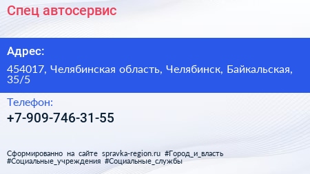 Спец, автосервис по адресу 454017, Челябинская область, Челябинск, Байкальская, 35/5 в дальнейшем Организация, размещена в следующих категориях: