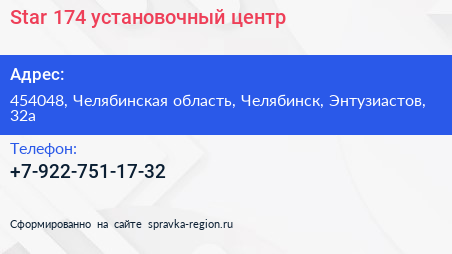 Star-174, установочный центр по адресу 454048, Челябинская область, Челябинск, Энтузиастов, 32а в дальнейшем Организация, размещена в следующих категориях: