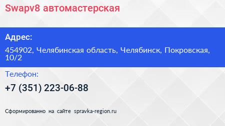 Swapv8, автомастерская по адресу 454902, Челябинская область, Челябинск, Покровская, 10/2 в дальнейшем Организация, размещена в следующих категориях: