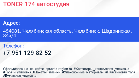 TONER 174, автостудия по адресу 454081, Челябинская область, Челябинск, Шадринская, 34а/4 в дальнейшем Организация, размещена в следующих категориях:
