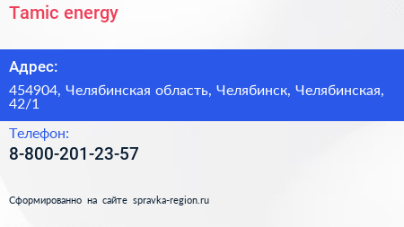 Tamic energy по адресу 454904, Челябинская область, Челябинск, Челябинская, 42/1 в дальнейшем Организация, размещена в следующих категориях: