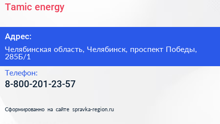 Tamic energy по адресу Челябинская область, Челябинск, проспект Победы, 285Б/1 в дальнейшем Организация, размещена в следующих категориях: