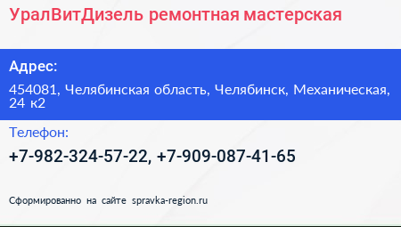 УралВитДизель, ремонтная мастерская по адресу 454081, Челябинская область, Челябинск, Механическая, 24 к2 в дальнейшем Организация, размещена в следующих категориях: