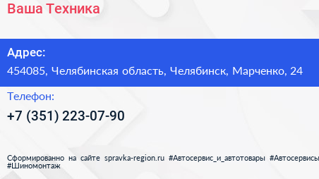 Ваша Техника по адресу 454085, Челябинская область, Челябинск, Марченко, 24 в дальнейшем Организация, размещена в следующих категориях: