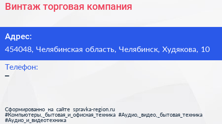 Винтаж, торговая компания по адресу 454048, Челябинская область, Челябинск, Худякова, 10 в дальнейшем Организация, размещена в следующих категориях: