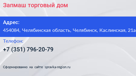 Запмаш, торговый дом по адресу 454084, Челябинская область, Челябинск, Каслинская, 21а в дальнейшем Организация, размещена в следующих категориях: