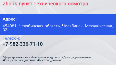 #Zhorik, пункт технического осмотра по адресу 454081, Челябинская область, Челябинск, Механическая, 32 в дальнейшем Организация, размещена в следующих категориях: