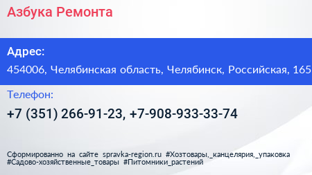 Азбука Ремонта по адресу 454006, Челябинская область, Челябинск, Российская, 165 в дальнейшем Организация, размещена в следующих категориях: