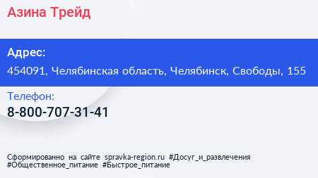 Азина-Трейд по адресу 454091, Челябинская область, Челябинск, Свободы, 155 в дальнейшем Организация, размещена в следующих категориях: