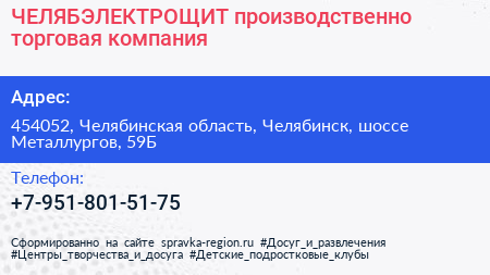 ЧЕЛЯБЭЛЕКТРОЩИТ, производственно-торговая компания по адресу 454052, Челябинская область, Челябинск, шоссе Металлургов, 59Б в дальнейшем Организация, размещена в следующих категориях: