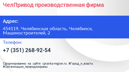 ЧелПривод, производственная фирма по адресу 454119, Челябинская область, Челябинск, Машиностроителей, 2 в дальнейшем Организация, размещена в следующих категориях: