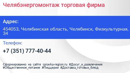 Челябэнергомонтаж, торговая фирма по адресу 454053, Челябинская область, Челябинск, Физкультурная, 34 в дальнейшем Организация, размещена в следующих категориях: