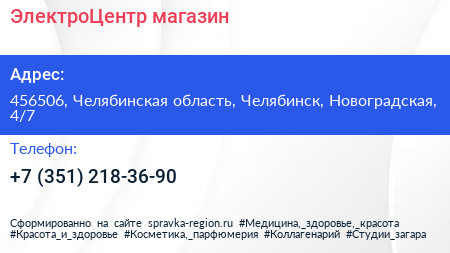 ЭлектроЦентр, магазин по адресу 456506, Челябинская область, Челябинск, Новоградская, 4/7 в дальнейшем Организация, размещена в следующих категориях: