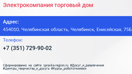 Электрокомпания, торговый дом по адресу 454010, Челябинская область, Челябинск, Енисейская, 75Б в дальнейшем Организация, размещена в следующих категориях: