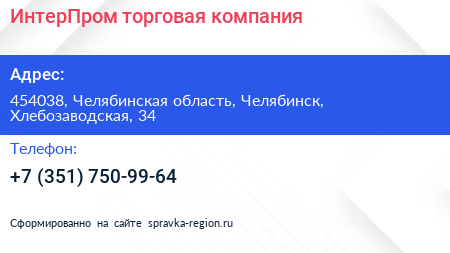 ИнтерПром, торговая компания по адресу 454038, Челябинская область, Челябинск, Хлебозаводская, 34 в дальнейшем Организация, размещена в следующих категориях: