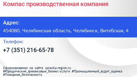 Компас, производственная компания по адресу 454080, Челябинская область, Челябинск, Витебская, 4 в дальнейшем Организация, размещена в следующих категориях: