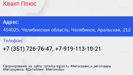 Квант-Плюс по адресу 454025, Челябинская область, Челябинск, Аральская, 212 в дальнейшем Организация, размещена в следующих категориях: