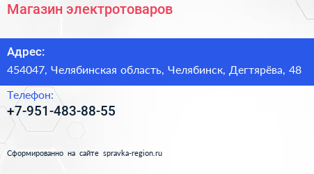 Магазин электротоваров по адресу 454047, Челябинская область, Челябинск, Дегтярёва, 48 в дальнейшем Организация, размещена в следующих категориях: