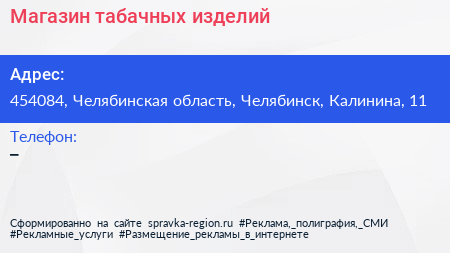 Магазин табачных изделий по адресу 454084, Челябинская область, Челябинск, Калинина, 11 в дальнейшем Организация, размещена в следующих категориях: