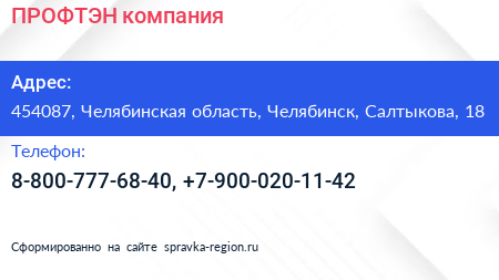 ПРОФТЭН, компания по адресу 454087, Челябинская область, Челябинск, Салтыкова, 18 в дальнейшем Организация, размещена в следующих категориях: