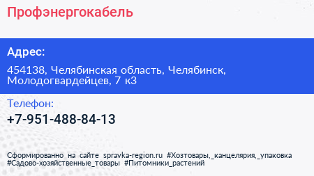 Профэнергокабель по адресу 454138, Челябинская область, Челябинск, Молодогвардейцев, 7 к3 в дальнейшем Организация, размещена в следующих категориях: