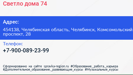 Светло дома 74 по адресу 454138, Челябинская область, Челябинск, Комсомольский проспект, 28 в дальнейшем Организация, размещена в следующих категориях: