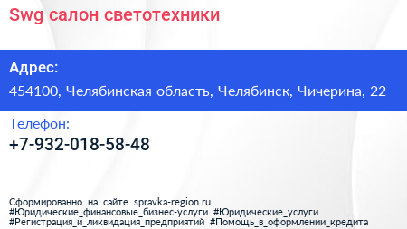 Swg, салон светотехники по адресу 454100, Челябинская область, Челябинск, Чичерина, 22 в дальнейшем Организация, размещена в следующих категориях: