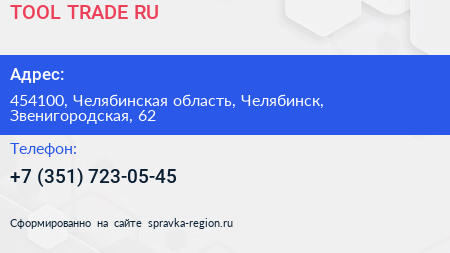 TOOL-TRADE.RU по адресу 454100, Челябинская область, Челябинск, Звенигородская, 62 в дальнейшем Организация, размещена в следующих категориях: