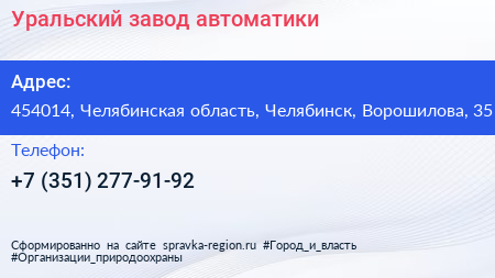 Уральский завод автоматики по адресу 454014, Челябинская область, Челябинск, Ворошилова, 35 в дальнейшем Организация, размещена в следующих категориях: