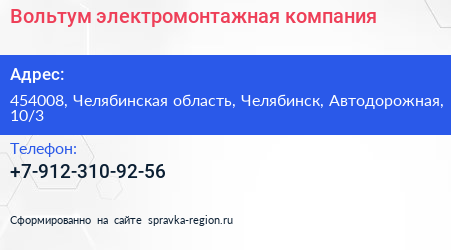 Вольтум, электромонтажная компания по адресу 454008, Челябинская область, Челябинск, Автодорожная, 10/3 в дальнейшем Организация, размещена в следующих категориях:
