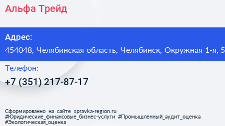 Альфа-Трейд по адресу 454048, Челябинская область, Челябинск, Окружная 1-я, 5 в дальнейшем Организация, размещена в следующих категориях: