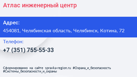 Атлас, инженерный центр по адресу 454081, Челябинская область, Челябинск, Котина, 72 в дальнейшем Организация, размещена в следующих категориях: