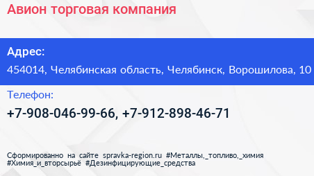 Авион, торговая компания по адресу 454014, Челябинская область, Челябинск, Ворошилова, 10 в дальнейшем Организация, размещена в следующих категориях: